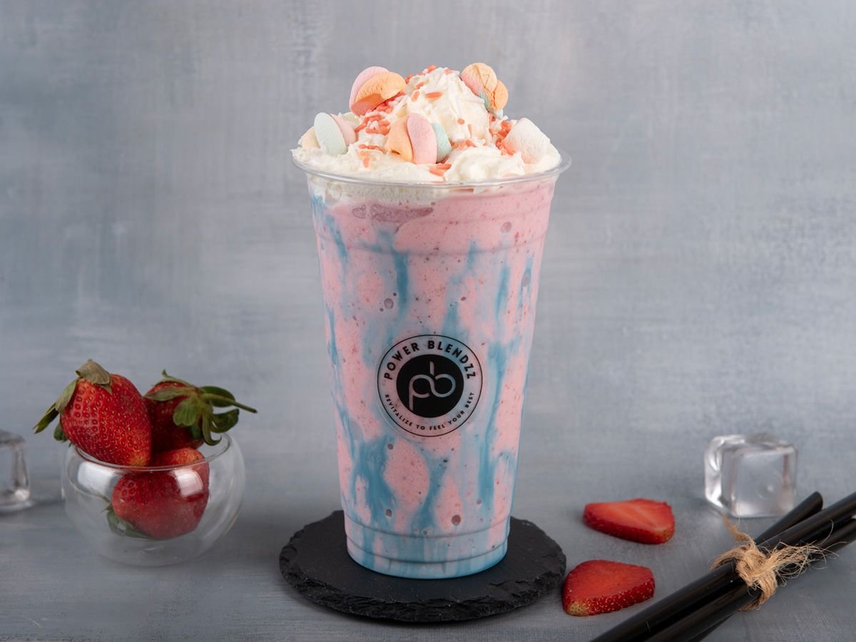 A creamy drink made by blending strawberries with milk, vanilla ice cream and strawberry syrup.